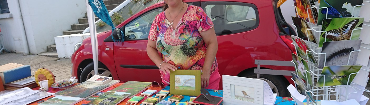 Al een tijdje sta ik met mijn schilderijtjes en fotokaarten op verschillende markten deze zomer. In juli en wel op ‘quatorze juillet’, een grote feestdag hier in Frankrijk, hadden we onze eerste ‘thuiswedstrijd’. We reserveerden een plek voor onze stand en vertrokken in alle vroegte met ons Twingootje vol richting Poullaouen bourg. In de weken voorafgaand was ik een nieuwe trend begonnen namelijk miniatuurschilderijtjes op ezeltjes schilderen. Het leek mij een echte blikvanger, zo’n serie kleine schilderijtjes en dan werd ‘kunst’ opeens betaalbaar. Jaren eerder had ik van mooi gelukte foto’s eens 16 x 100 postkaarten laten drukken en van mijn moeder kreeg ik een echt draaiend kaartenrek voor op de tafel.