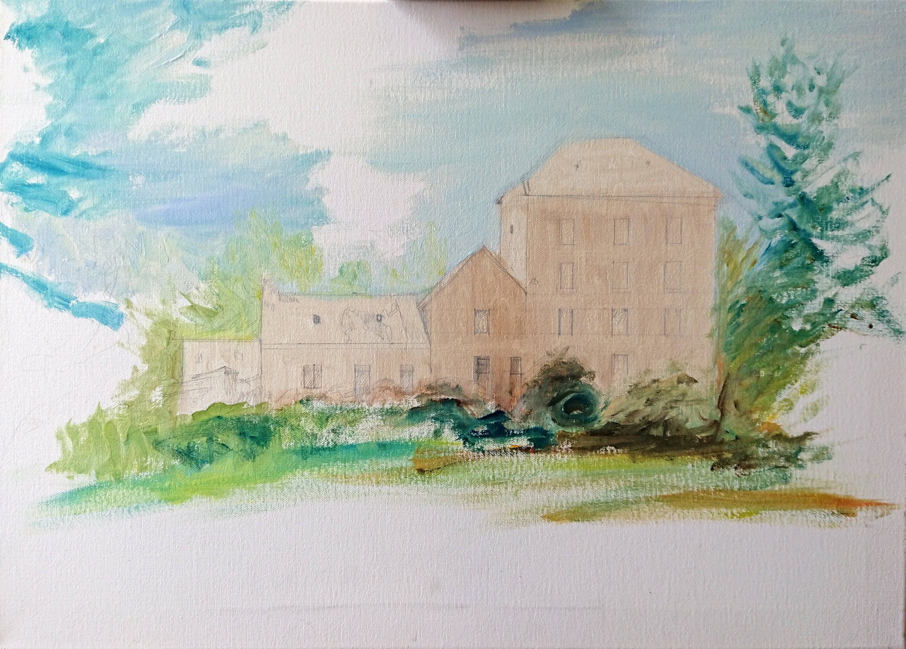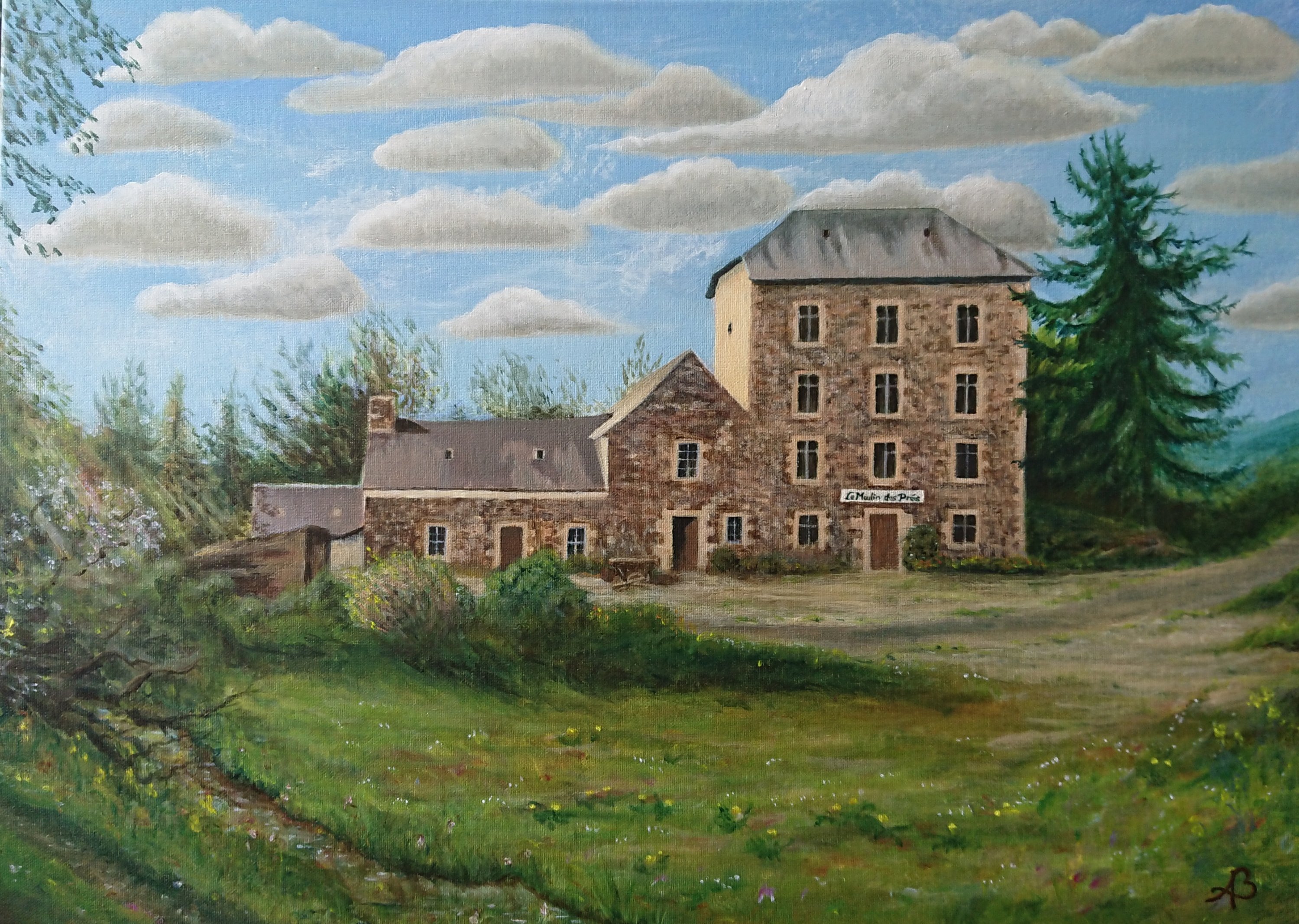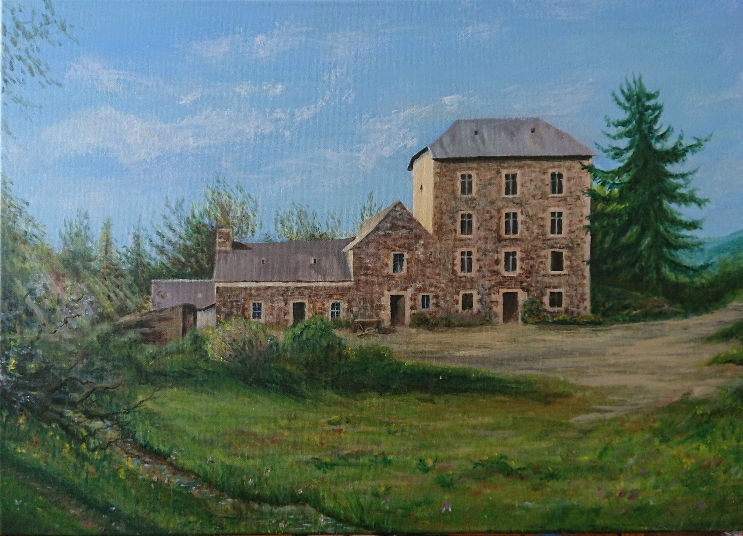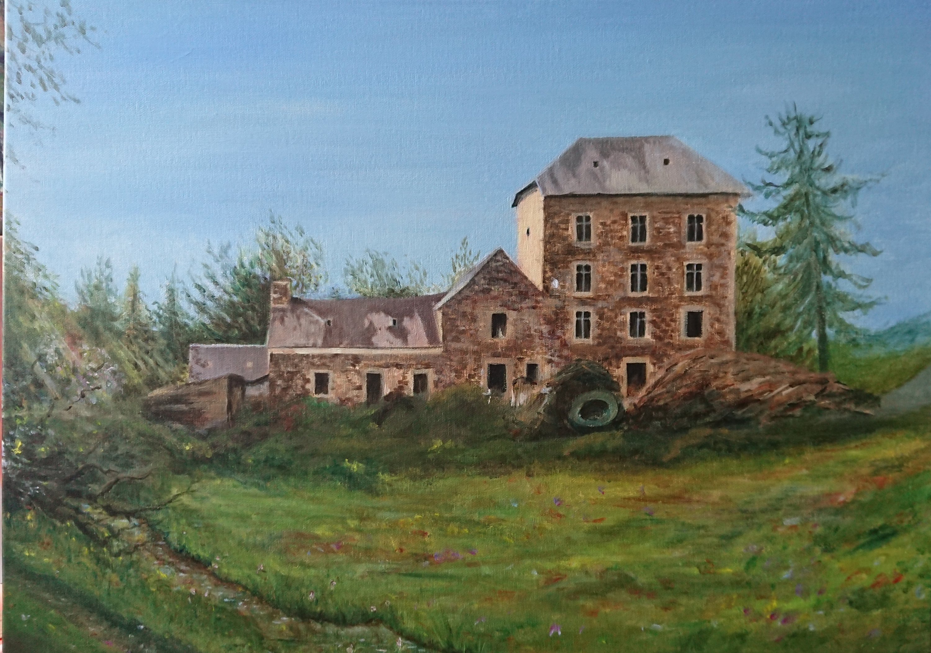 Een paar weken geleden begon ik aan de eerste schets en vandaag heb ik, steeds in overleg met Jean Claude, de laatste hand gelegd aan het beekje. Op de foto ligt er allerlei materiaal voor het huis en zie je alleen het veld ervoor. Op het schilderij heb ik de artistieke vrijheid gekregen om een open cour te schilderen en de beek die er stroomt binnen het beeld te betrekken. Ik zal het proces laten zien van foto tot schets tot eindresultaat en enkele stappen ertussenin. Maar ik begin met het resultaat.